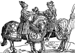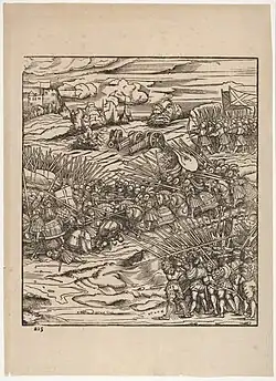 An Italian poem, La Rotta de Francciosi a Terroana on the fall of Therouanne was printed in Rome in September 1513.[51] Maximilian also commissioned woodcut images of his meeting with Henry from Leonhard Beck, and from Albrecht Dürer who included a scene of the mounted rulers joining hands in the Triumphal Arch.[52] Henry commissioned commemorative paintings of the meeting and of the battle which showed him involved in the centre of the action, though Hall pointed out he took advice to stay with the foot soldiers.[53] In Henry's inventory, one painting was noted as "A Table wherein is conteined the Seginge of Torney and Turwyn".[54] A painting made by "Master Hans", perhaps Hans Holbein in 1527 for a banqueting house at Greenwich Palace showed the siege of Therouanne with the "very manner of every man's camp". Henry VIII insisted that his guests, the French ambassadors, should turn to look at the picture.[55]