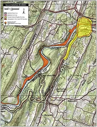 A unit of the Chesapeake and Ohio Canal National Historical Park is located along the Potomac near Hancock, and includes several signs commemorating the battle. The town of Hancock and the Confederate artillery positions can also be seen from the site.[14] Hancock held commemorative events for the battle from January 5 through 7th, 2012.[15] The battlefield is divided by US Route 522, although many of the battlefield features are still intact, including two churches damaged during the fighting.[16] None of the battlefield has been listed on the National Register of Historic Places, although a 2010 study by the American Battlefield Protection Program determined that 415.16 acres (168.01 ha) may be eligible for listing.[17] About 50 acres (20 ha) of the battlefield are owned through protective stewardship, including tracts owned by the National Park Service and the Maryland Department of Natural Resources.[18]