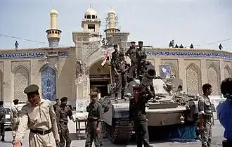 ![]() An Iraqi tank stands in front of the heavily damaged al-Abbas shrine, 1991 | |||||||||
