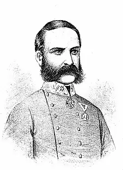 On June 12, 1848, the troops under the command of Colonel David Kräutner von Thatenburg set off from Pétervárad at 3 o'clock in the morning.[5] Who effectively commanded these troops was Captain Miksa Stein (1810-1860). His detachment consisted of 8 infantry companies: from the 39th Don Miguel and the 32nd Franz Ferdinand d'Esté Infantry Regiments seven companies; and one company of the Landwehr battalion from Pétervárad, 46 horsemen of the Imperial Hussars (forming one of the wings) and a six-pounder battery. These troops were mostly composed of Hungarians.[9] This totalled 1,100 people.[9] Hrabovszky's orders were for a military column to march to Karlóca, but at the same time, under Józseffalvalva (Hr. Josipovac)... a more vigorous demonstration is to be made.[9] Hrabovszky was prepared for one last eventuality. He ordered Captain Miksa Stein that "... if the insurgents are willing to reconcile, they should be given time to discuss [with the Hungarians]", and that hıs troops should only use weapons if they were attacked.[9] Beside Stein's troops, at the same time, Hrabovszky sent a column of some 5,000 men against the Roman trenches.[7]