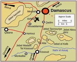 Kissoué was a strong defensive position. East of the road the gardens and houses of the town provided cover for infantry and tanks backed by the considerable defence works on the steeply rising Jebel el Kelb and Jebel Abou Atriz behind them. West of the road were the hills of Tel Kissoué, Tel Afar and Jebel Madani which commanded the roads to Damascus from both Quneitra and Daraa. The boulder-strewn country was virtually impassable by wheeled vehicles except on the road and made progress difficult even on foot.[2] Furthermore, the river Awaj flowed in front of the French positions across the Allied line of advance.