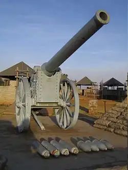 At the same time, the first shell from the Boers' "Long Tom" on Pepworth Hill landed in the town, causing consternation. The British field guns opened fire on Pepworth Hill and Long Hill, and temporarily silenced the Boer siege gun but Colonel Ian Hamilton's frontal attack on Pepworth Hill was called off as it became clear that Grimwood was in trouble, and Hamilton's attack would not be supported. Although the main body of South African Republic Boers under Commandant-General Piet Joubert were stationed behind Pepworth Hill, there were none on Long Hill, and fire on this hill was wasted. The British artillery itself came under accurate and effective fire from the Boers' field guns, which were fought as individual gun detachments, and were quickly moved between emplacements before British guns could find their range. The British guns were deployed as they had been drilled to do, in neat rows of six without using cover from artillery or even rifle fire. Their fire was not as effective as that of the Boer Staatsartillerie, and they incurred needless casualties.[8]