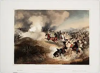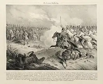 Meanwhile, the lieutenant colonel squadron of the Wallmoden Cuirassiers threw themselves on the center led by Perczel. Ottinger had ordered Sternberg to lead the attack in swarm formation, i.e. to move his cuirassiers forward in a broken-up rather than a close formation.[28] The Hungarian infantry battalion stationing there retreated to the right and engaged the attackers in grapeshot fire, but it reportedly flew over the heads of the cuirassiers.[28] The Nicholas Hussar company, which was there to defend the cannons, attacked the Cuirassiers from the flank, so they were forced to halt.[29] A bitter struggle began, during which the cuirassiers came within 20 paces of Perczel himself.[30] Lieutenant-General Zastavniković and Captain Count Pimodan distinguished themselves in the assault. The 14 cuirassiers, led by Sternberg in person, came within range of the battery; the first cannon was captured by Sternberg himself, the other three by the cuirassiers who were rapidly following him, among them Captain Georges Pimodan.[30] Pimodan cut off a wagoner of his horse, at which moment, according to his memoirs, half a company of hussars surrounded him. Pimodan stabbed the officer leading the hussars, but he had not even pulled the sword out of the wound when the hussars surrounded him, grabbing him by the arm and neck. Pimodan slashed one of his attackers in the face as their sword hits rained down on him. Desperately, he sat spurs to his horse, which finally freed him from the hussars. Pimodan received a cut to the head, another to the forehead, and one to his shoulder, and managed to escape only by great luck.[30] Thanks to the hussars' intervention the remaining two guns of the Hungarian battery escaped.[30] The 48th Battalion and the Bereg Company, which were on their left, repulsed the attack of the cuirassiers with volley fire after they formed a mass, and even temporarily recaptured the three guns from the enemy, but they could not tow them away, because they had no horses.[30] The fourth cannon was sent by Major Miklós Perczel toward Mór. Two cuirassiers tried to take the flag of the unit, but one of them was shot, to which the other fled.[30]