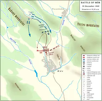 The Hungarian troops were deployed north of Mór along the road to Kisbér, in two lines: a mixture of hussars, infantry and cannons.[4] On the right flank, the 47th Home Army Battalion took up position, which was led by Major Ferenc Meszéna, the Chief of the General Staff. On the north side of the vineyard north of Mór, two seven-pounder howitzers and a six-pounder gun were deployed under the command of Lieutenant Mike.[18] Behind them were 4 companies of the 47th Battalion; the other two companies took a position in the stone-fenced tavern from Átk, which was on the right side of the road to Vértesnána. A hussar platoon was detached to secure the right flank.[19]