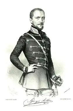 Lieutenant General Jelačić's I. Corps, which formed the right wing of Windisch-Grätz's army that attacked Hungary on 16 December, had several parts which before the battle, were stationed in various locations.[12] On 29 December, the Grammont Brigade, the 3rd (Franz Joseph) Dragoon Regiment and the Banderial (the Ban's) Hussar Regiment were stationed in Kisbér, the Hartlieb Division, the batteries and artillery reserve in Mezőőrs, and the Ottinger Brigade in the settlements between Mezőörs and Kisbér.[13] Jelačić had intended to give his troops a rest day on 30 December, but at his headquarters in Kisbér he was informed that Perczel had left the settlement that morning with 8,000-10,000 men (according to other sources, 8,000 infantry, 600-800 cavalry and 24 guns) and marched to Mór.[14] Major General Zeisberg, the Corps Chief of Staff, suggested Jelačić to attack the enemy. Jelačić, who had set up his headquarters in the castle owned by Kázmér Batthyány (one of the most radical Hungarian politicians) in Kisbér, apparently inspired by his earlier success in the Battle of Bábolna, was so delighted by the idea that he wanted to move with his troops out that night for attack, but his officers dissuaded him, pointing the tiredness of the troops.[14] It was also mentioned, according to the diary of Hermann Dahlen, the Ban's aide-de-camp, that Mór lies in the middle of the vast Bakony forest, from which the enemy can easily slip away under cover of darkness through an area unknown to us.[14] After the officers expressed their fear that Windisch-Grätz would prevent them from attacking with some counter-order, Jelačić vowed to lead them against the enemy, to reach Perczel, he added with a laugh, even if I have to chase him to Asia. Then he raised his glass: To our victory! To those who will stand out in battle tomorrow.[14]