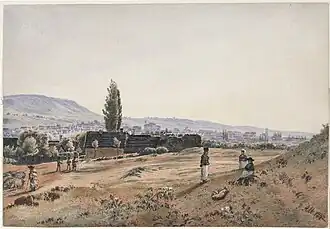 The Hungarian troops on the right flank were led by the Chief of General Staff Ferenc Meszéna, who withdrew them through Pusztakápolna and Gánt towards Csákvár, shortly after the massive Austrian attack against the center.[38] He may have been convinced to retreat by the fact that Jelačić sent the 3rd Dragoon Regiment, which had arrived in the meantime, to bypass the Hungarian right flank.[38] Therefore, the retreat was not completely ordered, but it was carried out with great haste, during which some troop units broke up, and some units broke away from the army and retreated by other routes.[38] The 6th company bypassed Mór and left the battlefield through the vineyards. Three cannons from the artillery "wandered through the woods and hills, mostly without roads", not under the command of the battery commander, Lieutenant Mike, but under the command of the commanding officer, Károly László, retreated through Kápolna and Gánt to Csákvár.[39] Meszéna, according to his memoirs, gathered nearly 2,000 men from the retreating Hungarian forces on the way; however, this probably included also the 48th Battalion and the Bereg company. The 47th battalion arrived in Csákvár later in the evening, after Miklós Perczel's 48th Battalion.[34] Görgei, who was on reconnaissance on the same day, met many of the fleeing soldiers from Mór.[40] Those who fled from Mór poured to Pest in groups, and their appearance and their accounts about the defeat discouraged the Committee of National Defence (which was, de facto, the independent Hungarian government, after the open conflict with the Habsburgs started). On 31 December the Committee sent an order to Görgei to Buda.[41]