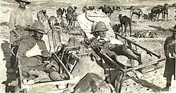After their retreat from El Arish, the Ottoman garrison withdrew down the Wadi el Arish 25 miles (40 km) south east of El Arish, to Magdhaba and Abu Aweigila, about another 15 miles (24 km) further away from the coast, on the banks of the wadi.[32] At Magdhaba the garrison had increased from 500 to about 1,400 Ottoman soldiers; there may have been as many as 2,000, consisting of two battalions of the 80th Infantry Regiment (27th Ottoman Infantry Division but attached to the 3rd Ottoman Infantry Division for most of 1916). These two battalions, the 2nd Battalion, commanded by Izzet Bey, of about 600 men and the 3rd Battalion, commanded by Rushti Bey, were supported by a dismounted camel company and two squads from the 80th Machine Gun Company. (The remainder squads of the 80th Machine Gun Company had been moved north to Shellal.) The defending force was also supported by a battery of four Krupp 7.5 cm Gebirgskanone M 1873 guns (on loan from the 1st Mountain Regiment), since the 80th Regiment's own artillery battery was stationed at Nekhl. Also attached to the Ottoman garrison at Magdhaba were a number of support units, including elements of the 3rd Company of the 8th Engineer Battalion, 27th Medical Company, 43rd Mobile Hospital and the 46th Cooking Unit. The garrison was under the command of Kadri Bey, the commanding officer of the 80th Infantry Regiment.[37][38]