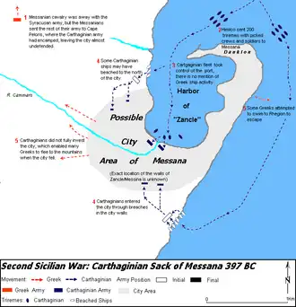 While part of the Carthaginian army assembled on the shore in Cape Peloris, two hundred triremes, packed with picked soldiers and rowers sailed south to Messene. This contingent quickly reached the city, aided by the north wind, and landed the soldiers near Messene before the Greeks could double back.[8] After taking control of the harbor, Carthaginians entered the city, while part of their forces may have landed to the north and/or south of the city and attacked the place from both landward and seaward side,[29] many Carthaginians had gained access through breaches in the city wall.[30]