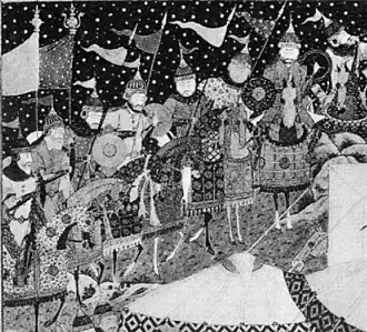 Jahanshah Bahadur led his army toward Qara Yusuf's forces. Qara Yusuf skillfully divided his troops into four wings. These began launching volleys of arrows (referred to as Kiyāni bows and Hadhang arrows). Each arrow felled a Timurid soldier.[7] Qara Yusuf suddenly charged the Timurid army, further disorienting them. The Timurid ranks collapsed under this coordinated assault. Jahanshah, seeing many of his soldiers wounded, fled the battlefield.[8]