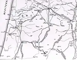 After the cavalry breakthrough on the coast, the XXI Corps would advance to capture the headquarters of the Ottoman Eighth Army at Tulkarm together with sections of the lateral railway line in the Judean Hills between Tulkarm and Nablus, a branch of the Jezreel Valley railway, which supplied the two Ottoman Armies, including the important railway junction at Messudieh in the Judean Hills.[3][12] The infantry divisions were to continue their attack by swinging north–east, pivoting on their right to push the defenders back out of their trenches away from the coast and back into the Judean Hills towards Messudieh.[13]