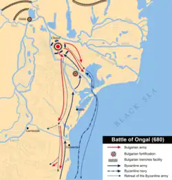 ![]() The foundation of the First Bulgarian Empire. The army of Asparukh is in red. The army of Constantine IV is in blue. | |||||||||