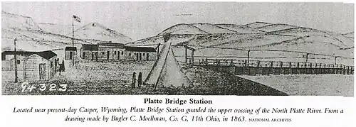 The Platte River bridge was a key crossing point of the North Platte River for wagon trains of emigrants traveling the Oregon and Bozeman Trails. The Indians especially wanted to halt traffic on the Bozeman Trail which led through the heart of their hunting territory. The bridge had been constructed in 1859 and was almost 1,000 feet long and 17 feet wide.[18] On the south side of the river was the military post and stockade, staffed by 100 soldiers, a dozen or more armed civilians, a few Shoshoni scouts, and an office of the Overland Telegraph Company. The soldiers were low on ammunition.