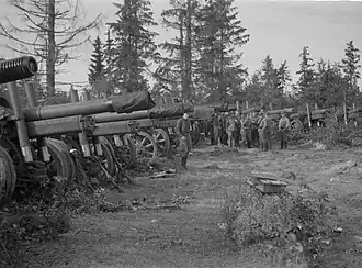 ![]() Soviet artillery pieces of the 101st Howitzer Artillery Regiment captured at Porlampi | |||||||