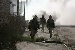 ![]() 1st Armored Division soldiers take up positions on a street corner during a foot patrol in Ramadi, August 2006 | |||||||
