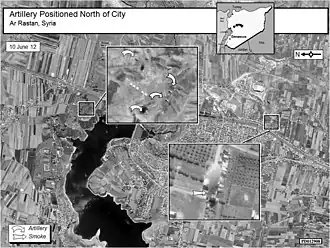 In June, Syrian troops bombarded Rastan using helicopters and mortars, killing and wounding a large number of rebel fighters, including Ahmad Bahbouh, head of the rebel military office in Rastan.[7][8] United Nations monitors confirmed that Syrian Air Force helicopters fired on towns near Homs, including Rastan. For the first time, the UN also verified repeated allegations by activists that government forces fired from helicopters in the military crackdown on dissent. Kofi Annan said he was "gravely concerned" at this news and a UN spokeswoman said that "artillery and mortar shelling, machine guns and smaller arms" were being used against the towns of Rastan and Talbiseh.[9]