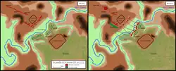 The campsite was to be laid out on a hill which gently sloped down to the river. On the other side of the river there was another hill directly opposite, similarly sloping. The top of that hill was densely wooded but the lower part was open and sloped down to the river over a distance of 200 paces (roughly 300 metres (330 yd)). The enemy was concealed inside the woods, but a few cavalry pickets could be seen in the open area by the river. The river was very wide, but only about three feet (one metre) deep.[13]
