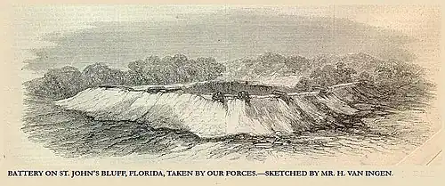 Early in the war, in order to stop the movement of Union Navy ships up the St. Johns River, Confederate Brigadier General Joseph Finnegan established an artillery battery on St. Johns Bluff, on the south side of the river 18 miles downstream from Jacksonville, Florida. The Union victories at Fort Donelson and Fort Henry forced Florida Confederates to go to Tennessee to reinforce the Confederate Army. With few resources Finnegan managed to fortify St. Johns Bluff where Confederate troops used slave labor to construct defenses.[3] This was part of a series of Confederate defensive works that had been constructed near Fort Caroline and Yellow Bluff Fort.