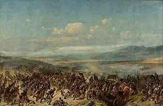 Meanwhile, the patrol sent by Lüders towards Marosvásárhely returned, reporting to him that no Hungarian troops would come from that direction.[6] Thus understanding that he could attack Bem's army with all his troops, he went from the left wing to the center to take over his troops from Ivin.[12] During these events Bem decided to make the decisive move to obtain victory, so he sent three infantry companies from his right wing on the left wing to join the attack in the Segesvár forest. On his left wing only three infantry companies and three and a half cavalry companies remained.[14] Lüders observed that Bem strengthened his left wing, weakening his right, so he sent two Jäger companies and a half light battery, which arrived around 5 p.m. to reinforce his left wing. At the same time, he replaced his artillery from the center with six guns of a heavy battery. At 4 p.m. Lüders sent four Uhlan companies and a half-light battery against the Hungarian right wing.[15] At 5 p.m. the Russian artillery hit and destroyed Bem's two ammunition wagons.[15] After the superior Russian artillery defeated the crippled Hungarian artillery, Lüders decided to apply the decisive blow, so he ordered a cavalry charge against the Hungarian right flank under the command of General Dimidov.[6]
