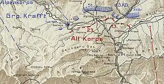 On 27 August 1916, Romania declared war on Austria-Hungary and proceeded to invade the Hungarian region of Transylvania. The Romanian campaign plan called for the Olt-Lotru Group of the Romanian 1st Army under the command of General Ioan Culcer to secure the basin between Nagytalmács (Tălmaciu/Talmesch) and Nagyszeben (Sibiu/Hermannstadt). The area between Nagyszeben and the northern exit of the Turnu Roșu Pass was the designated assembly area for the 1st Army's Olt-Lotru Group. Opposing the Romanian invasion of Transylvania was the Austro-Hungarian 1st Army under the command of General Arthur Arz von Straussenburg.[1] Nagyszeben (Sibiu/Hermannstadt) was occupied on 2 September by advanced troops of the Romanian 1st Army. However, the Romanians evacuated the city on the following day.[2] Erich Ludendorff referred to this in his memoirs, stating that, after taking Brassó (Brașov/Kronstadt) on 29 August, "Rumanian patrols were soon seen in Hermannstadt.".[3] The Romanians were plainly apprehensive that, in order to keep Nagyszeben under occupation, they would have to extend their bridgehead-like formation beyond capacity.[4]