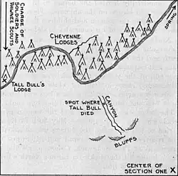 Major Frank North saw an Indian rise from cover and take aim at him. He shot and killed the man, who turned out to be Chief Tall Bull.[11] Meanwhile, the Pawnee surrounded 20 Cheyenne warriors who were sheltering in a ravine. Armed only with bows and arrows, the Cheyenne kept their attackers at bay until their arrows ran out, whereupon the Pawnees moved in and killed them all.[10]