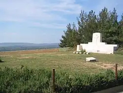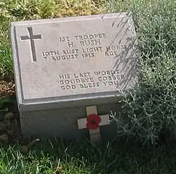 Efforts were made by the Australians to recover their dead throughout the months following the battle, the 20th Battalion managing to recover the bodies of several men from the first wave, including White in October.[87] Most were unrecoverable during the campaign. When Australian Commonwealth burial parties returned to the peninsula in 1919 after the war's end, the bones of the dead light horsemen were still lying thickly on the small piece of ground. The Nek Cemetery now covers most of no-man's land of the tiny battlefield and contains the remains of 316 Australian soldiers, most of whom fell during the 7 August attack; only five could be identified.[88] Trooper Harold Rush of the 10th Light Horse Regiment died in the third wave. His body was one of the few identified, and he is buried in Walker's Ridge Cemetery. His epitaph famously reads: "His last words, Goodbye Cobber, God bless you".[63]