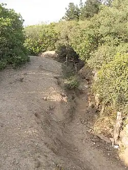 The Ottoman front line at the Nek consisted of two lines of trenches, with machine guns positioned on the flanks on spur lines, which provided clear fields of fire into no man's land in front of the Ottoman position.[16] Behind this another eight trenches existed, tiered along the slopes towards Baby 700. At least five groups of machine guns – approximately 30 altogether – were located in the area, providing direct fire support to the Ottoman troops holding the Nek.[17][18] These positions were widely dispersed and positioned in depth, at least 200 yards (180 m) from the Ottoman front line.[19] The commanders of the two Ottoman regiments occupying positions around the Nek had chosen not to cover their trenches, despite orders from their divisional headquarters, due to concerns that a bombardment would collapse the roofs and block communication through the trenches, similar to what had occurred at Lone Pine.[20]