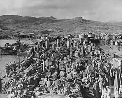The majority of the ships for the assault of Tinian were loaded at Tanapag Harbor on Saipan by troops of the Saipan Island Command. Ten preloaded tank landing ships (LSTs) with three and a half days' supply of water, rations, medical supplies and ammunition on their top decks were allocated to each division and eight to the NTLF.[76] Fourteen pontoon barges were loaded with drums of fuel and towed to positions off the reef to supply fuel to amphibious vehicles and landing craft.[77] After the initial landing, loaded trucks and trailers were embarked on landing craft, which shuttled them to Tinian where they unloaded at dumps and then returned on landing craft. Twenty landing craft mechanized (LCMs), ten landing craft tank (LCTs) and eight LSTs were assigned to this role, along with 88 2½-ton 6×6 trucks and 25 trailers.[77]