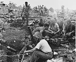 The nighttime actions had depleted the 4th Marine Division's ammunition, so Cates delayed attacking on 25 July until 10:00 to allow time to replenish. In the meantime, the rest of the 2nd Marine Division began landing.[92] As they moved north along the coast through terrain characterized by coral rocks and thick undergrowth, the 1st Battalion, 8th Marines, was held up by a force of 20 to 25 Japanese that it took until 11:30 to overcome. On their right, the 2nd Battalion, 8th Marines, reached the Ushi Point airfield, and the 24th Marines reached airfield No. 3.[93][94] The 25th Marines was confronted by the most formidable obstacle of the day, Mount Maga, which was captured with a double envelopment.[93][95]