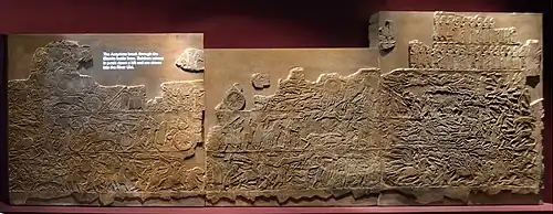 As an innovation for Assyrian relief art, the cycle of battle is based on the Egyptian depictions of the Battle of Kadesh, which are more than 600 years older.[9]