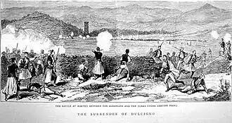 Montenegro accepted the propositions made at the meeting of the Great powers in Istanbul, in 1880 in order to exchange the regions of Hoti and Grude with Ulcinj.[2] Officially, the Porte did not resist the decision but explained that the Albanians would resist. The Ottomans had intention to delay cession of Ulcinj to Montenegro hoping to eventually avoid it, but Great powers were not ready to accept any delay and threatened to use force against the Ottomans.[3] The Ottomans supported Prizren League as long as their interest corresponded with the interests of the League.[4] According to some reports, the Ottomans actually armed Albanian irregulars with 3,000 rifles and 1,000 cases of ammunition in the coordinated actions of Shkodër vali Izet Pasha, commander of Ottoman forces in Tuzi Osman Pasha and Odo Beg Sokolović who was appointed as commander of the forces of Prizren League.[5] Ulcinj had been the main port of Shkodra in order to get access to the Adriatic Sea. The Albanians vehemently protested towards this, calling it injustice.[6] The Great powers did however nothing to take into consideration the demands of the Albanians. The Ottomans, expecting trouble, sent their forces in Ulcinj to clear it from resistance. The Albanians, under the leaders of Isuf Sokoli, Haxhi Mehmet Beci and Mehmet Gjyli responded with an armed uprising. The Ottomans were unable to get to the Albanians as they had surrounded the city. The Great powers threatened with a naval demonstration if the Ottomans did not overrun the Albanians.[7]