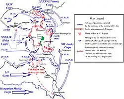 On 1 August, the Soviet 18th Army attempted to join the Ponedelin group from the south. But the divisions on the right flank of the XXXXIX Mountain Corps repelled the attack of the Soviet 17th Rifle Corps, and by evening the 18th Army was attacked by units of the LII Army Corps and Hungarian Mobile Corps. The commander of the 18th Army gave the order to retreat to Pervomaysk. At the same time, the attacks of the XXXXIX Mountain Corps against the Ponedelin group distracted the Soviet units and allowed the 1st Mountain Division to move even further to the east.[19]