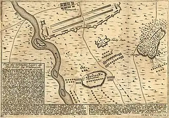 On October 19, Howe withdrew the British forces from Germantown and focused on the defense of Philadelphia. British military engineer Capt. John Montresor supervised the building of a series of fourteen formidable redoubts that began at Upper Ferry, along the Schuylkill River, and extended eastward to the shores of the Delaware River, just north of Philadelphia.[16][17] Howe took advantage of his time in Philadelphia to raise additional forces from the loyalist population in the region. Newly-promoted Maj. John Graves Simcoe reinforced his unit, the Queen's Rangers, which had lost over a quarter of its men at the Battle of Brandywine.[18] William Allen, Jr., the son of notable loyalist William Allen, raised the 1st Battalion of Pennsylvania Loyalists, and was made its lieutenant colonel.[19] Loyalist James Chalmers raised the 1st Battalion of Maryland Loyalists, and was given its command.[20] Recruitment also took place among the city's Irish Catholic population, with the formation of the Irish Catholic Volunteers, and in the counties immediately surrounding Philadelphia.[21] In mid-November, the fall of Forts Mifflin and Mercer effectively ended American control of the Delaware River, and much-needed supplies began arriving at the city's docks, along with 2,000 additional British soldiers.[22]