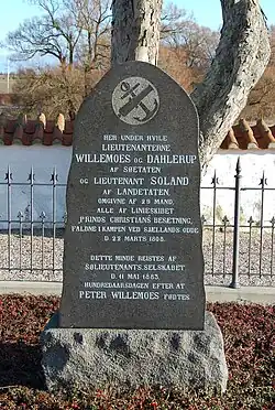 Peter Willemoes and the other Danish casualties were after the battle buried in a communal grave at Odden churchyard, near the scene of the Battle of Zealand Point, where their gravestone can still be seen. A monument commemorating the battle and the Danish casualties was also erected in the churchyard. It consists of a Neoclassical column featuring a plaque with an incidental poem by N.F.S. Grundtvig ('De snekker de mødtes i kvæld på hav').[11] A commemorative stone with a relief of a crowned anchor and an inscription has been erected on the beach.[12]