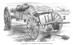 While the British were holding their advance, on the far right, Bosquet's 2nd Division arrived at the river's mouth and encountered steep cliffs rising 50 m above the river. The Russians considered the cliffs so steep that they deemed it unnecessary to defend the position with artillery. Leaving their kitbags on the riverbank, the Zouaves at the division's head started to swim across the river and rapidly climbed the cliffs using the trees to scale it.[14] Once they had reached the plateau, they hid behind rocks and bushes to engage the defending forces of the Moscow Regiment and held the position until reinforcements could arrive. Following the Zouaves, more soldiers scaled the cliffs and carried 12 guns up a ravine. They arrived just in time to meet the extra infantry and artillery that Menshikov had transferred from the center in an attempt to organize the resistance and prevent the Russian Army from being outflanked on its left.[15]