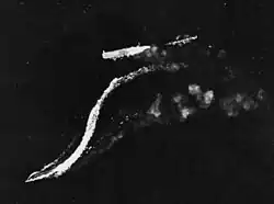 About a minute later, at 16:46, a third and last bomb (also a 241-kilogram (531 lb) "land" bomb), dropped by Petty Officer Kazumi Horie, hit Enterprise on the flight deck forward of where the first two bombs hit. This bomb exploded on contact, creating a 10-foot (3 m) hole in the deck but causing no further damage.[45] Seven D3A dive bombers—three from Shokaku and four from Zuikaku—then broke off from the attack on Enterprise to attack the battleship USS North Carolina, but all were shot down by anti-aircraft fire or U.S. fighters. The attack was over at 16:48, and the surviving Japanese aircraft reassembled in small groups and returned to their ships.[46]