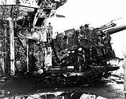 Just 30 seconds later, the next D3A dive bomber, piloted by Petty Officer Tamotsu Akimoto, planted its 241-kilogram (531 lb) high-explosive "land" bomb only 15 feet (4.6 m) away from where the first bomb hit. The resulting detonation ignited a large secondary explosion from one of the nearby 5-inch (127 mm) guns' ready powder casings, killing 35 members of the nearby gun crews and starting a large fire.[45]