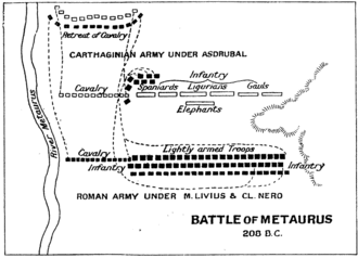 The battle was fought on the banks of the Metaurus River, near Montemaggiore al Metauro.[1] The exact numbers of troops on both sides are not known. The Romans estimated 8,000 Ligurians in Hasdrubal's army, making up one-third of his infantry.[2] The data given by the ancient sources are often either insufficient or very contradictory. Appian for instance says that the Carthaginian force numbered 48,000 infantry, 8,000 cavalry, and 15 elephants.[3] Livy claims that there were 61,400 slain or captured Carthaginian soldiers at the end of the battle and there were still more who escaped the slaughter.[4]