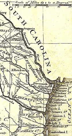 ![]() A 1796 map showing the Savannah area. Hutchinson Island is in the Savannah River near the town. | |||||||