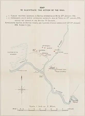 The Battle of Wadi, occurring on 13 January 1916,[2] was an unsuccessful attempt by British forces fighting in Mesopotamia (present-day Iraq) during World War I to relieve beleaguered forces under Sir Charles Townshend then under siege by the Ottoman Sixth Army at Kut-al-Amara.[3][4]