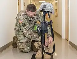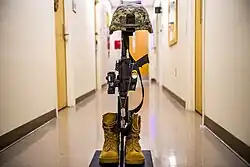 The Battlefield Cross, alternatively referred to as the Fallen Soldier Battlefield Cross, Soldier's Cross, or just Battle Cross, is a symbolic replacement of a cross, or memorial marker appropriate to an individual service-member's religion, on the battlefield or at the base camp for a soldier who has been killed. It is made up of the soldier's rifle stuck into the ground or the soldier's boots, with a helmet on top. Dog tags are sometimes placed on the rifle, and the boots of the dead soldier can be placed next to the rifle. The purpose is to show honor and respect for the dead at the battle site. The practice started during World War I, as a sign of respect for those that gave their lives in combat during wartime.[1] Today, it is a means of showing respect for the dead amongst the still-living troop members. It is commonly seen in the field or base camp after a battle, especially among American troops in Afghanistan or Iraq. While it is used less today as a means of identification, it still serves as a method of mourning among the living, as attending the funeral is not always possible for soldiers still in combat.