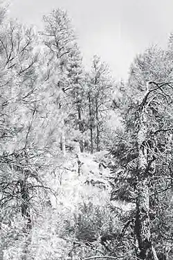 On the morning of Tuesday, October 8, the posse awoke, had breakfast, and then saddled to continue down the river. Along the way they passed the Pair-O'Dice Ranch. The area is part of the White Mountains and thus heavily forested and difficult to traverse. It was also very cold, and snow covered the ground. That day the Smith Gang was camped at Reservation Creek, just inside the western border of the Fort Apache reservation, in a canyon 200 yards (180 m) wide and 100 feet (30 m) deep, near the source of the Black River. Today the location is near the shoreline of Reservation Lake. The Smith gang were in need of food so that afternoon they killed a bear, and the shots were heard by the posse 0.5 miles (0.80 km) away. Eventually, the Maxwell brothers found the location of the bear shooting and blood trails in the snow led back to the Smiths' camp, which was 6 miles (9.7 km) from where the posse camped. By then it was almost night. As the posse approached the canyon, the Smiths' guard dog began barking. This alerted Bill Smith, who went up to the canyon's rim to have a better look. There he saw the posse coming towards the camp, so he ran back to tell the others.[2]