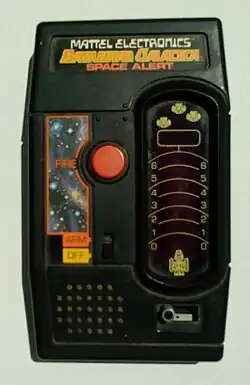 In 1978, Mattel Electronics released a handheld electronic LED game based on the series. The player tries to defend Galactica from kamikaze Cylon Raiders by manipulating a switch on the game unit to direct their fire, triggered by a red button to the left of the unit.[47]