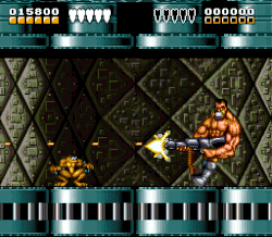 Battletoads/Double Dragon is a beat 'em up video game where the players, as either one of the three Battletoads or Jimmy and Billy, attack enemies, swing ropes, go on spaceships, and turbo bike to defeat the Shadow Boss and Dark Queen.[12] It has three play modes: a single-player, a "2 Players A" mode where the players can hit each other, and a "2 Players B" that doesn't have that.[13] Its engine and gameplay is from the original Battletoads,[14] and less like Double Dragon.[15] Like the prior Battletoads installment, there are only three continues and no password system,[16] and in the two-player modes, if one player loses all lives, both players have to start a level over.[17] The 16-bit versions have identical gameplay to their NES counterparts, attacks and jumping are triggered by only two buttons.[18]