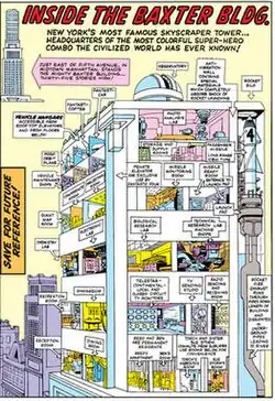 The Baxter Building is a fictional 35-story office building appearing in American comic books published by Marvel Comics. Created by Stan Lee and Jack Kirby, the building first appeared in Fantastic Four #3 (March 1962). The construction is depicted in Manhattan, and its five upper floors house the Fantastic Four's headquarters.[2][3][4][5]