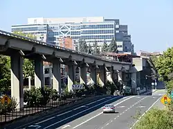 Construction of the system began in 1964, and included a number of major engineering challenges, including excavating subway tunnels in San Francisco, Oakland, and Berkeley; constructing aerial structures throughout the Bay Area, particularly in Alameda and Contra Costa counties; tunneling through the Berkeley Hills on the Concord line; and lowering the system's centerpiece, the Transbay Tube connecting Oakland and San Francisco, into a trench dredged onto the floor of San Francisco Bay.[36] Like other transit systems of the same era, BART endeavored to connect outlying suburbs with job centers in Oakland and San Francisco by building lines that paralleled established commuting routes of the region's freeway system.[37] BART envisioned frequent local service, with headways as short as two minutes between trains through the Transbay Tube and six minutes on each individual line.[38]