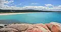 The Bay of Fires is a region of white beaches, blue water and orange-hued granite (the colour of which is actually produced by a lichen). The northern section of the bay is part of Mount William National Park; the southern end is a conservation area.[5]