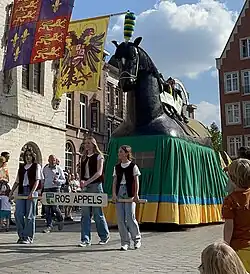 Since the Middle Ages, Bayard has been an important figure in northern French and Belgian folklore, particularly in the Ardennes, notably in Bogny-sur-Meuse, Dinant, Namur and Dendermonde. Folk processions stage it among the processional giants, namely the Ducasse d'Ath and the Ommegang van Dendermonde.[1] The widespread dissemination of his legend and its success have influenced many artists, as well as popular beliefs.