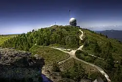 Immediately east of the Vogelsang is the Grafling Saddle (Graflinger Paßsenke), which follows the valleys of the Kollbach and Teisnach rivers from Gotteszell in the north to Grafling in the south. It is the most prominent gap in the Anterior Bavarian Forest and is crossed by the Bundesstraße 11 which climbs up to a height of 583.7 m.[3] Immediately to the east of the pass are the Riegel Mountains (Riegelbergen) with the Einödriegel (1,121 m) to the north and the Breitenauriegel (1,116 m) to the south of the highest point of the Anterior Bavarian Forest. South of it and separated by the state road, St 2135, is a chain of summits, the Hausstein Mountains (Haussteinberge) and Leopoldswald, running eastwards. The Hausstein reaches a height of 917 m, the Fürberg in the far east climbing to 880 m.