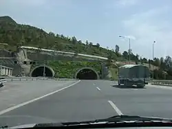 Named initially Karşıyaka Tunnels, they were renamed later to Bayraklı Tunnels upon the request of the Bayraklı district's governor.[4] The 320 and 317 m (1,050 and 1,040 ft) (Bayraklı-1) and 1,865 and 1,876 m (6,119 and 6,155 ft)-long (Bayraklı-2) twin-tube tunnels carry three lanes of traffic in each direction. Dangerous goods carriers are not permitted to use the tunnel.[5] Instead, they have to use either of the given routes: