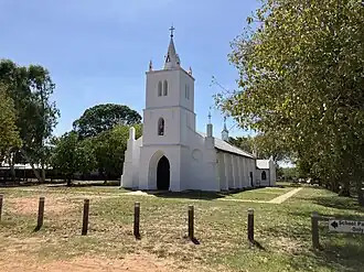 Beagle Bay's church was built by interned local Germans during World War I, and officially opened in 1917. It is famous for its interior decorated with mother of pearl, cowrie, volute and olive snail shells.[13]